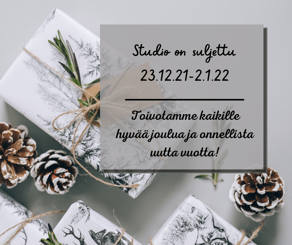 Vuosi 2021 alkaa olemaan pulkassa ja on aika ottaa hengähdystauko ennen vuotta 2022. Olemme lomalla ja studio on suljettu ke 23.12.2021- su 2.1.2022.